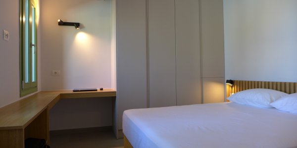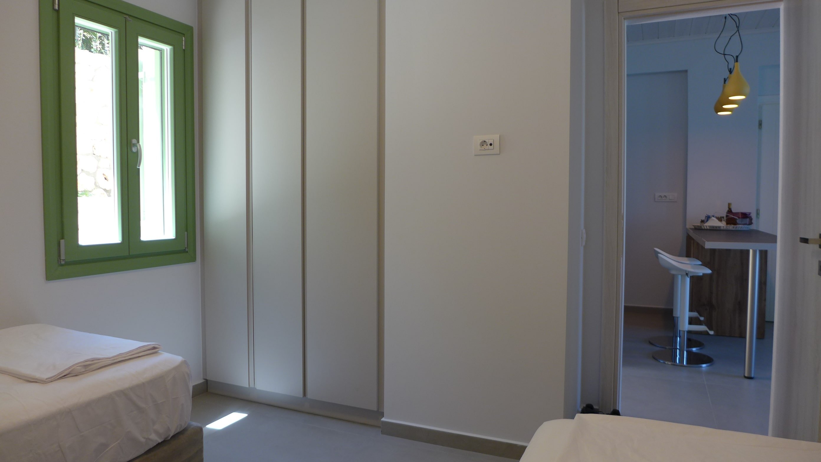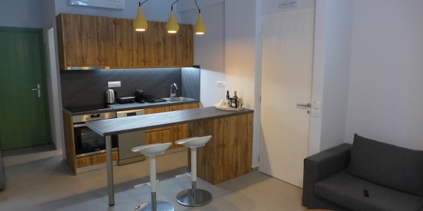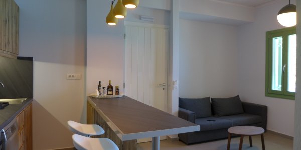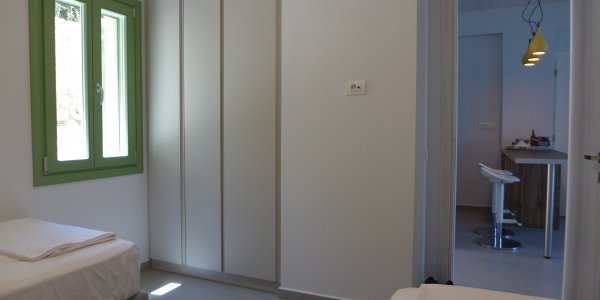 Two bedroom apartment, 51 m2, on the ground floor: bedroom 1 with double bed and see view; bedroom 2 with two single beds, that can be combined to a double bed; Living room with sofa bed (sleeps one person), smart TV, open space, & fully equipped kitchen: Stove, Microwave, Dishwasher, refrigerator, Nespresso, Hair dryer; bathroom with shower; terrace in front with sea view, pool view, and table for 6; Terrace in the back.