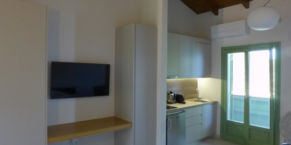 Single room, 28 m2, on the 1st floor with sea view: 1 double bed, Smart TV; kitchenette: cooktop, microwave, small refrigerator, Nespresso; bathroom with shower; balcony with sea view, table for 2. Hair dryer, safe box. Can be combined with Caltabania Suites 2
